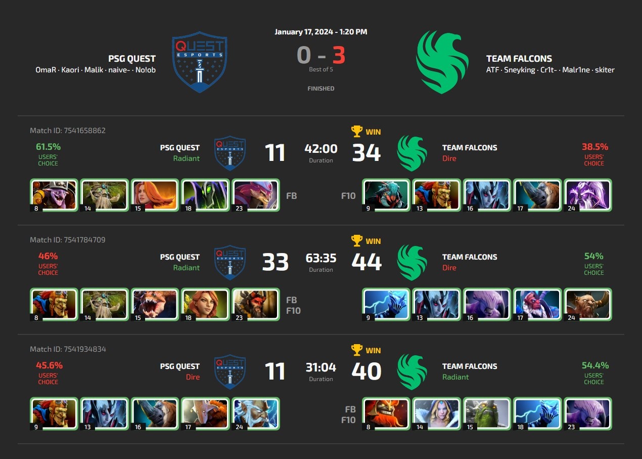 Следующими квоту заработали Team Falcons, которые уже в третий раз подряд оставили Quest без крупного турнира, переиграв их в финалах квалов. Не помог их соперникам и уход тренера за день до финальной игры. Лишь наоборот, представил команду в еще более безыдейном виде. Несмотря на небольшие шансы во второй карте, гранд-финал вышел "в одни ворота", о чем и свидетельствует итоговый счет 3-0.