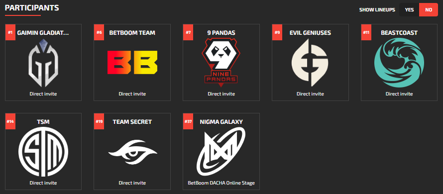 Seven participants received direct invitations from the tournament organizers, while Nigma Galaxy qualified through the Online Stage.