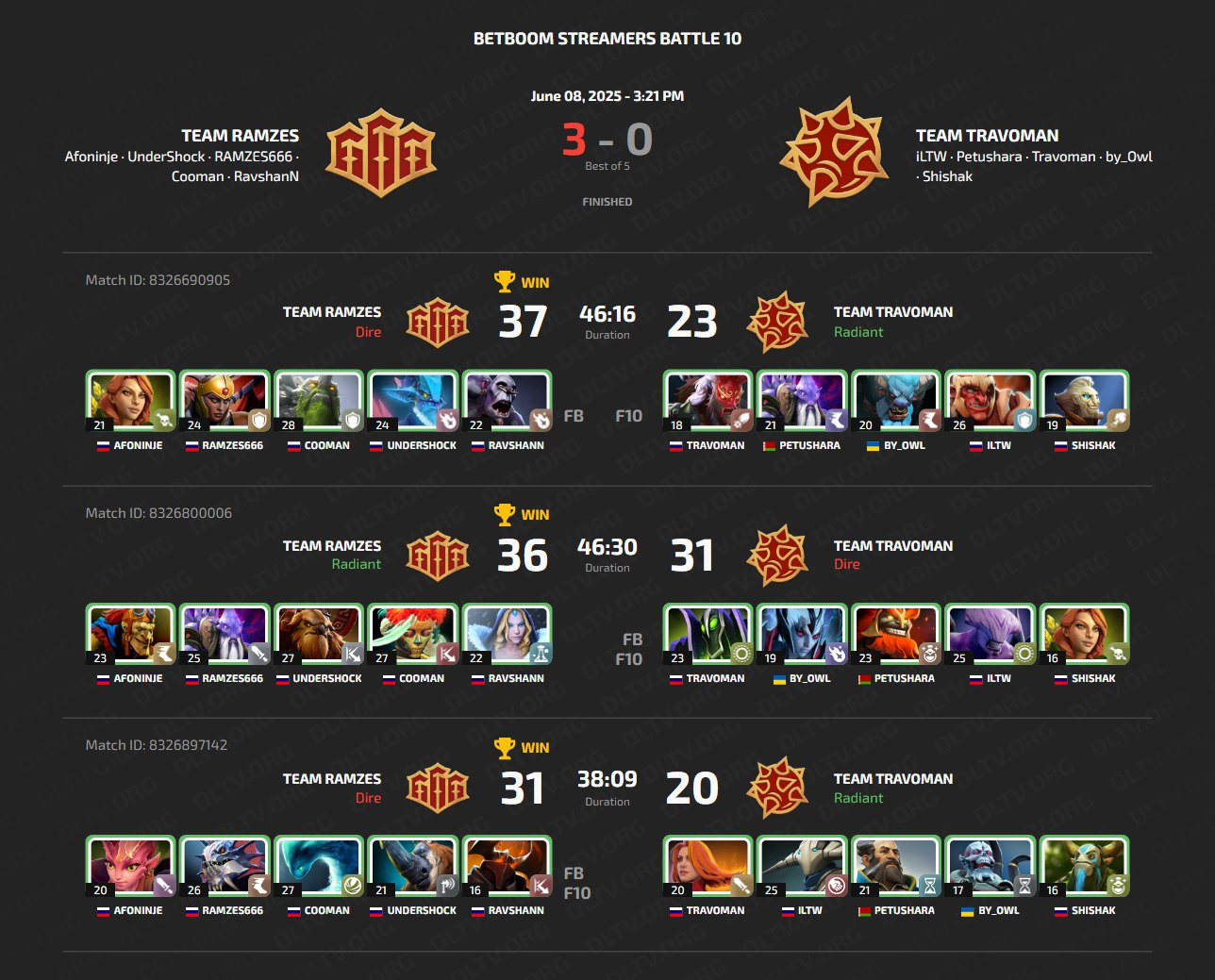 Skončil mediální turnaj BetBoom Streamers Battle 10, šampiony se stali Team RAMZES. Za první místo tým obdržel 2 miliony rublů. Lídr týmu - RAMZES666 se stal nejlepším hráčem turnaje, navíc si vydělal 200 tisíc rublů. Cooman obdržel 75 tisíc rublů za nejvíce zabití - 181, a Afoninje postavil nejvíce wardů - 250, za což také obdržel 75 tisíc rublů.